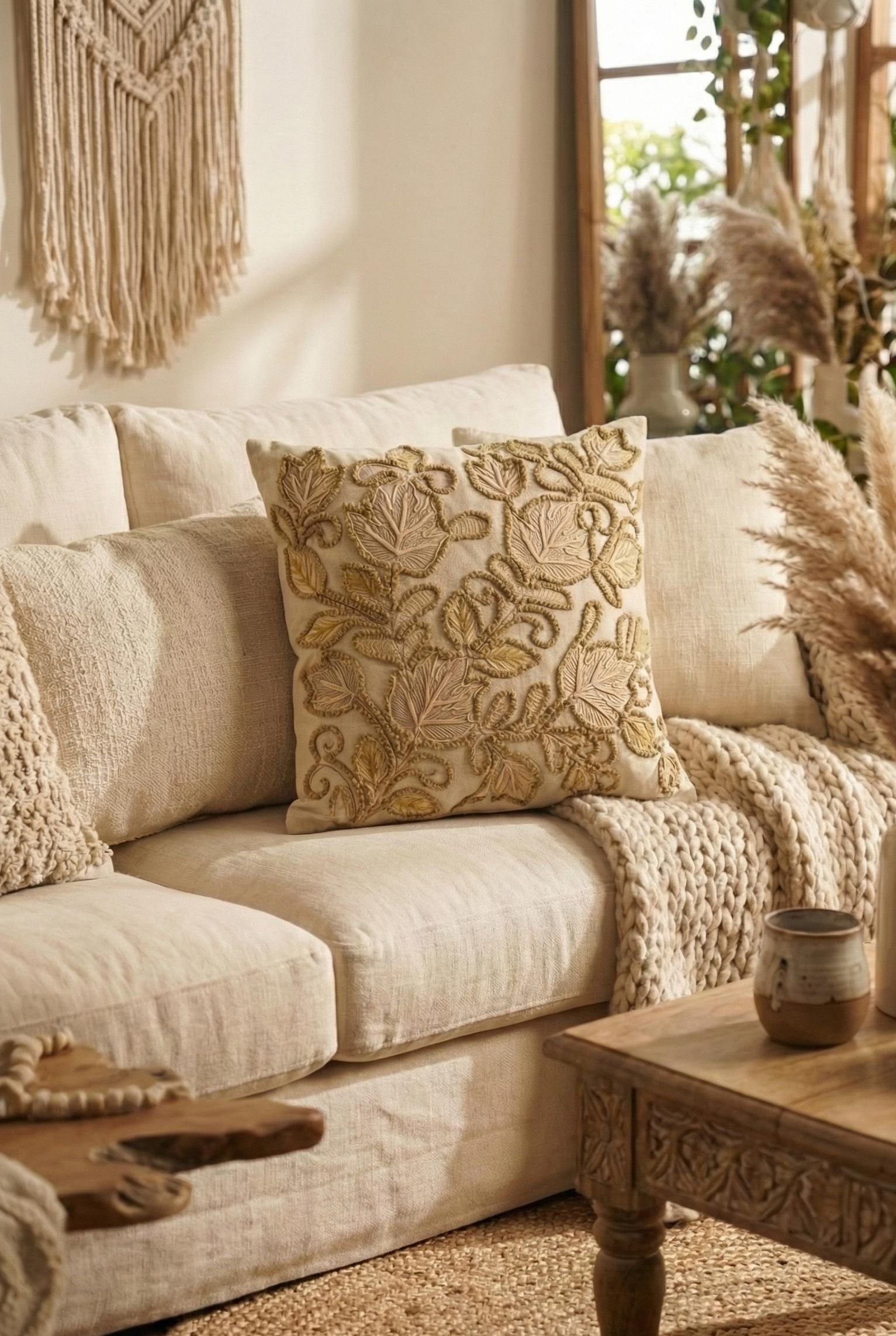 This cushion showcases high-relief embroidery — featuring hand-done cord outlines, knotted edges, and padded stitches to create a dimensional leaf pattern. Artisans combine chain stitch, raised satin, couching, and knotwork to highlight each vein and edge of the foliage. The result is a beautifully tactile surface, crafted meticulously on a sturdy cotton base, reflecting both heritage skill and modern refinement.