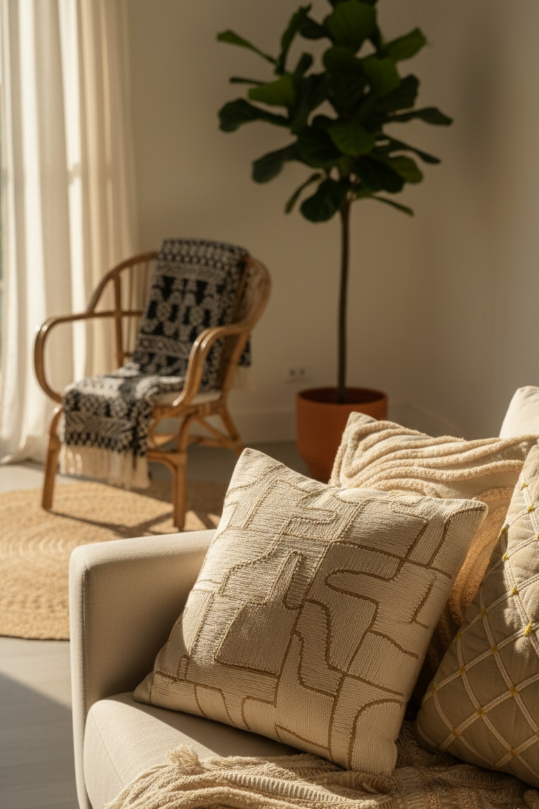 The Textured Labyrinth Cushion stands out for its striking interplay of structure and softness. Inspired by abstract mazes and pathways, its intricate stitched pattern adds a modern architectural rhythm to the surface. The cushion’s minimalist tone makes it versatile, while the raised stitching provides a sculptural dimension that enriches neutral interiors with subtle sophistication.