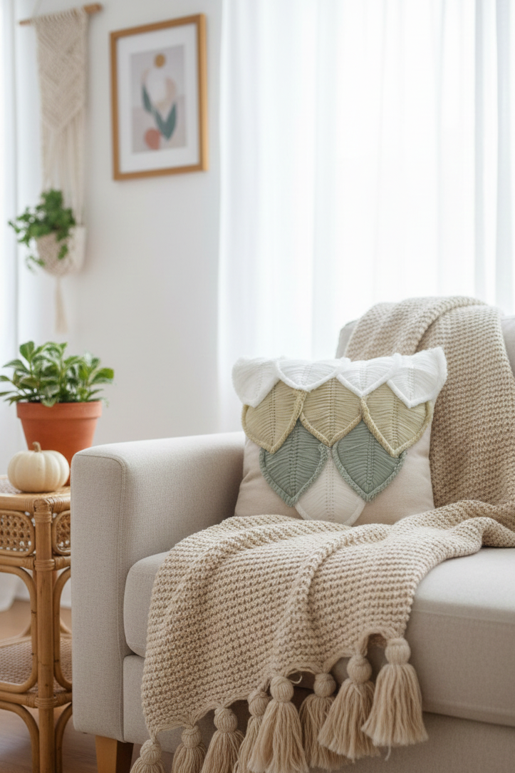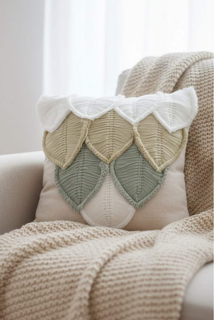 Story of the product: Nine layers of handcrafted nature, intricately sculpted on a handloom canvas. Let our 'Whispers of the Woods' cushion cover add a touch of rustic charm to your home, with its overlapping pattern of grey and beige beetle leaf-shaped feathers. Breathe life into your spaces, invoking the soothing harmony of a woodland whisper with every detail and texture.