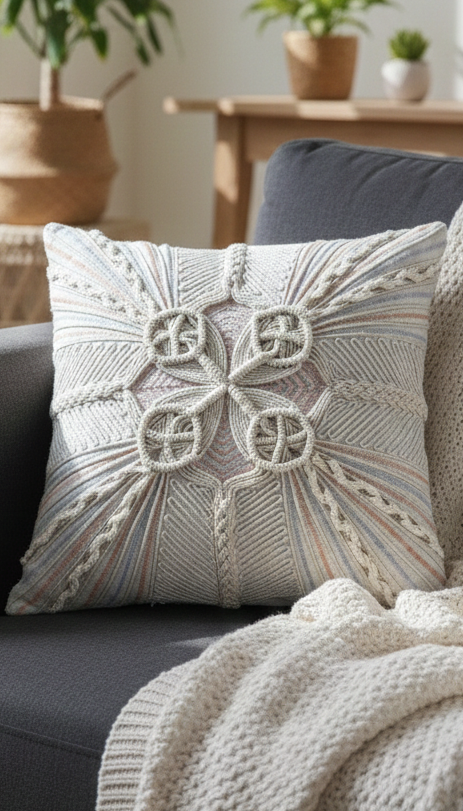The cushion features a refined design with intricate macrame work, adding a distinctive texture and visual appeal. The base fabric, a soft and breathable handloom cotton, ensures both comfort and durability. The combination of these high-quality materials reflects exceptional craftsmanship and a commitment to artisanal excellence.